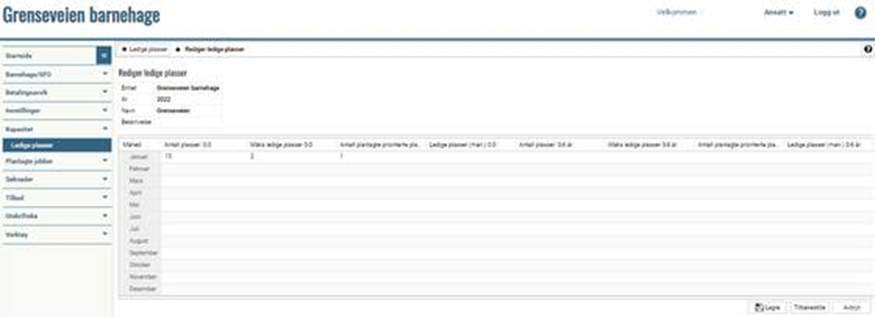 I bildet som åpnes legger du inn totalt antall plasser barnehagen har, og antall ledige plasser. Antallet som legges inn vil vises i publikumsportalen ut den måneden tallene er registrert for. Hvis barnehagen i slutten av måneden fortsatt har ledige plasser, registreres disse inn på neste måned (merk at det kan ta opptil 1 time før tallene vises i publikumsportalen).