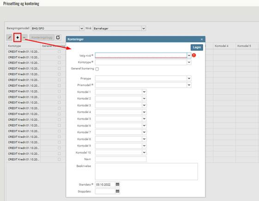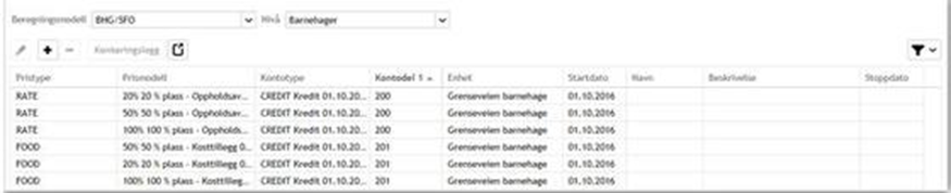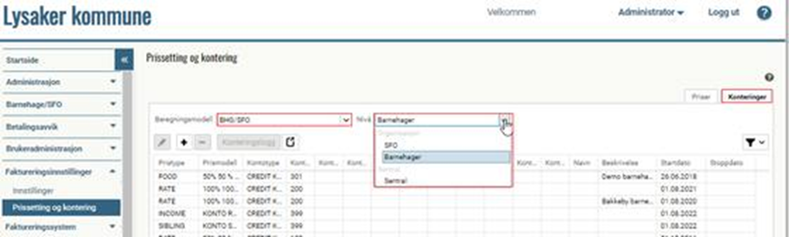 Gå til Faktureringsinnstillinger > Prissetting og kontering > fane Konteringer Fra nedtrekksmenyen velger du beregningsmodell BHG/SFO, og deretter velg ønsket nivå (f.eks. Barnehage eller SFO). I eksempelet nedenfor er det valgt nivå Barnehage, men det er akkurat samme fremgangsmåte om du velger enhetsnivå SFO for å registrere enhetspriser):