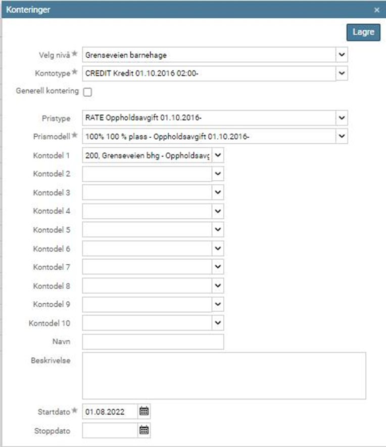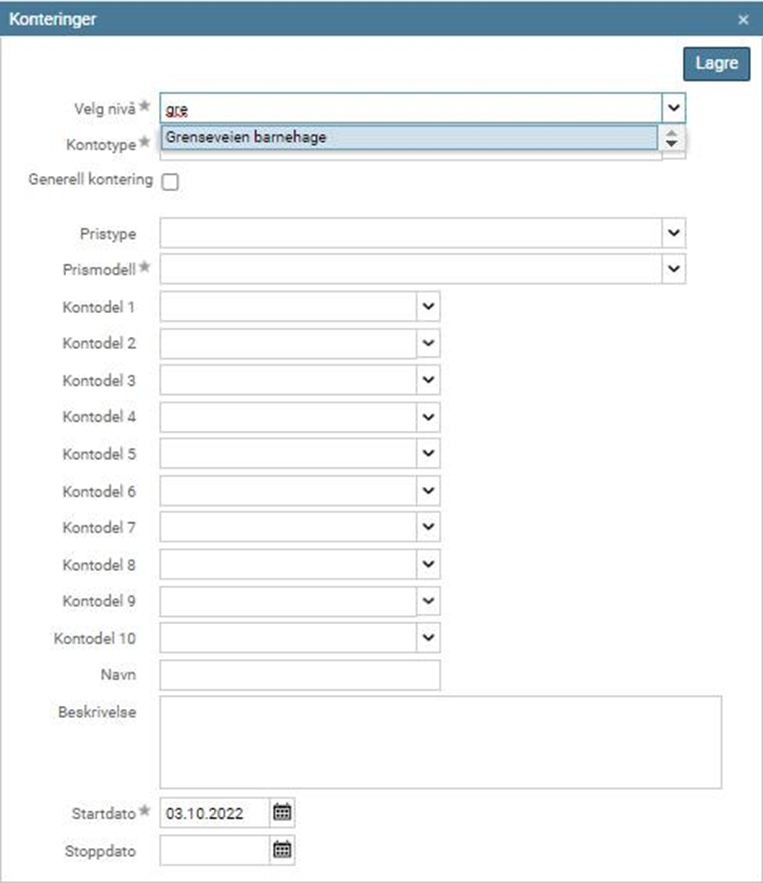 Velg deretter aktuell Pristype, Prismodell, Kontotype, samt korrekt varenummer i feltet Kontodel 1. (Dersom det er lagt opp til at koststed / oppdragsgivernummer også skal registreres her, velges dette fra feltet Kontodel 2.) Trykk Lagre.