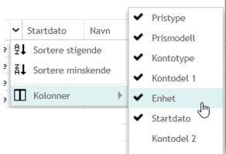 Merk at du kan hente frem kolonnen Enhet for å se hvilke enheter som vises i listen: