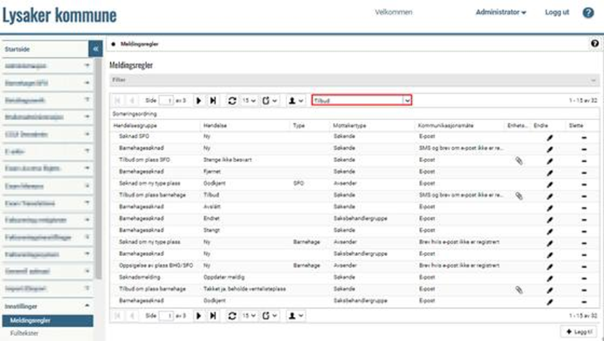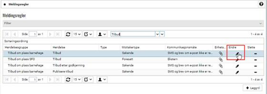 Klikk på blyantikonet i kolonnen Endre ved meldingsregelen / tilbudsbrevet som har Hendelse = Tilbud (dersom systemet benyttes av både barnehage og SFO vil det finnes to meldingsregler med hendelsestype Tilbud):