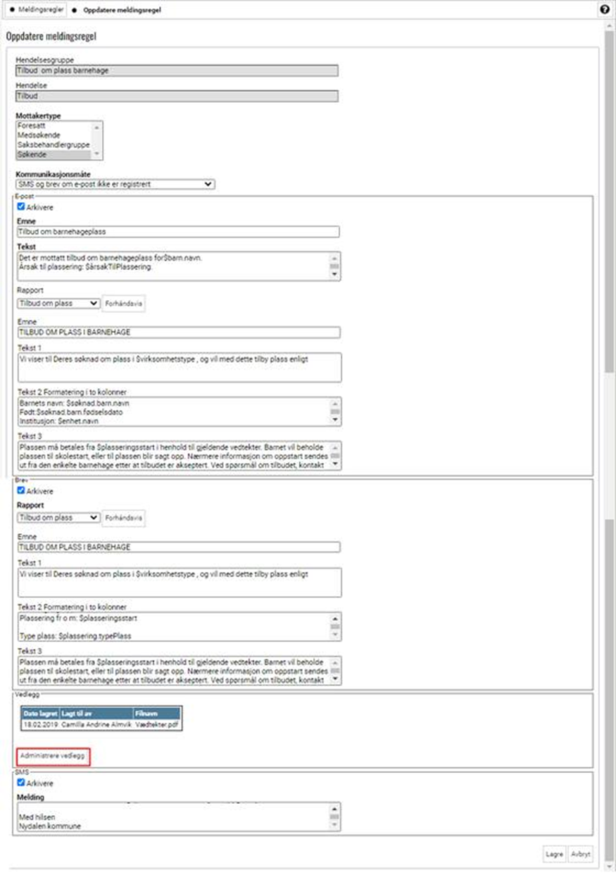 Gjenta eventuelt ovennevnte prosedyre i forbindelse med flere meldingsregler med samme hendelse, samt ifm meldingsregelen med hendelse Publisere tilbud (sistnevnte gjelder kun barnehage).