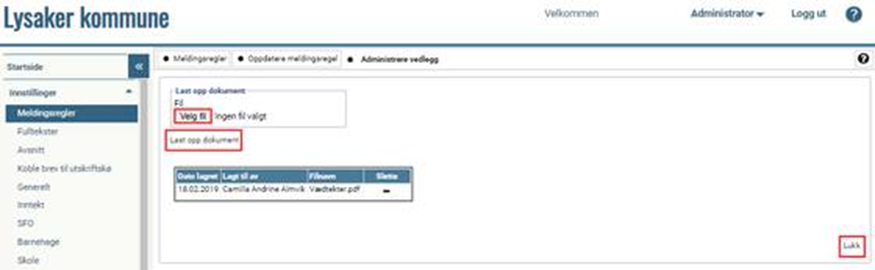 Trykk på Velg fil og hent inn ønsket vedlegg (fil). Trykk deretter på Last opp dokument før du trykker på Lukk og deretter Lagre: