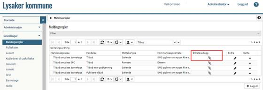 Klikk på bindersikonet i kolonnen Enhetsvedlegg ved meldingsregelen / tilbudsbrevet som har Hendelse = Tilbud (dersom systemet benyttes av både barnehage og SFO vil det finnes to meldingsregler med hendelsestype Tilbud):