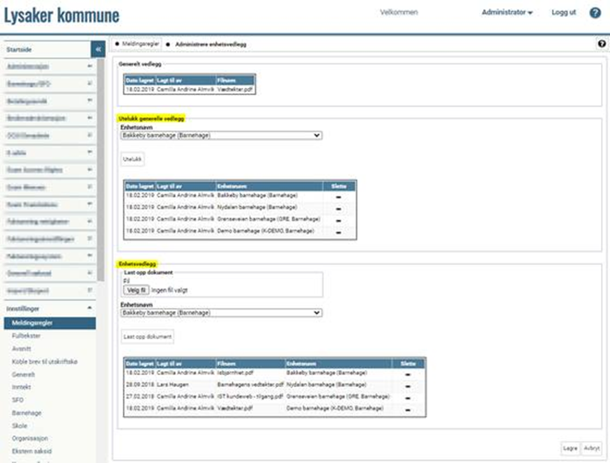 Ved å benytte enhetsvedlegg kan du utelukke et generelt vedlegg og erstatte dette med et vedlegg knyttet til enheten (f.eks. vedtekter for private barnehager).