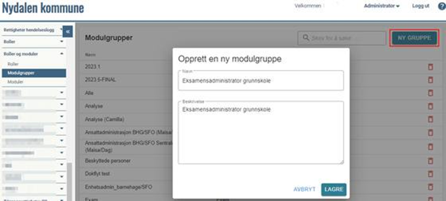 Gå til Roller og moduler > Modulgrupper Klikk på Ny gruppe Velg navn og beskrivelse på den nye modulgruppen og trykk på Lagre: