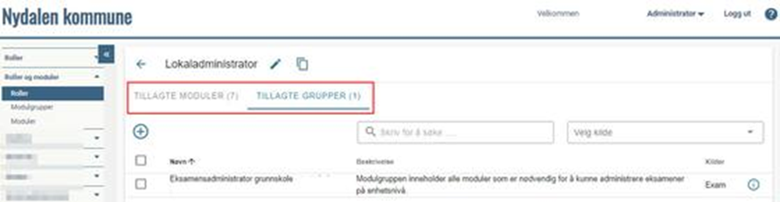 Det kan ta noen sekunder fra du har opprettet en ny modulgruppe, til den er klar til å kobles til en rolle. (Se egen guide hvordan du bygger en rolle basert på en modulgruppe). Bildet nedenfor er et eksempel på en rolle (Lokaladministrator) som er bygd opp av syv moduler og en modulgruppe: