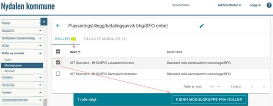 På fanen Roller ser du antall roller som er bygd opp med modulgruppen, og rollene vises i listen nedenfor. Fra dette grensesnittet kan du også slette denne modulgruppen fra en valgt rolle om ønskelig.