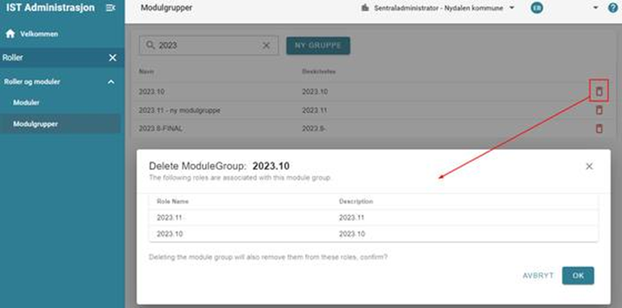 Det er mulig å slette modulgrupper selv om de er benyttet i aktive roller. Du vil få beskjed om hvilke roller modulgruppen finnes i, og beskjed om at hvis du sletter modulgruppen vil alle modulene i gruppen fjernes fra disse rollene. Du slipper derfor å manuelt fjerne modulgrupper fra roller før du sletter modulgruppen.