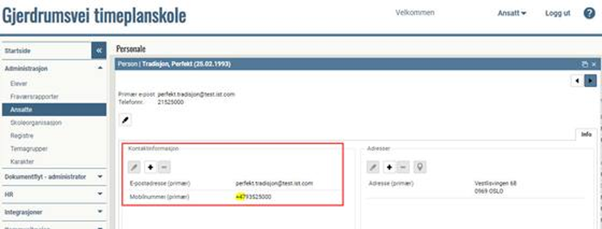 Både administratoren og gruppeansvarlige (faglærere) må ha registrert en e-post (primær) og mobiltelefon (primær) på personkortet i IST Administrasjon. Merk at telefonnummeret må legges inn med +47 foran: