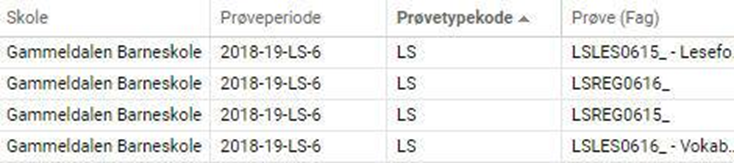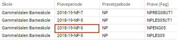Prøveperiode er bygd opp slik: skoleår-prøvetypekode-årstrinn. I feltet Prøve (Fag) vises prøvekoden fra PAS: