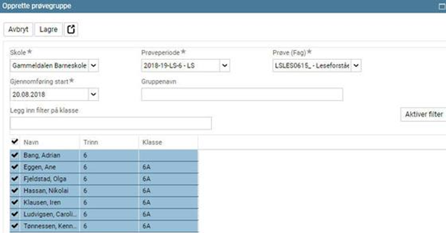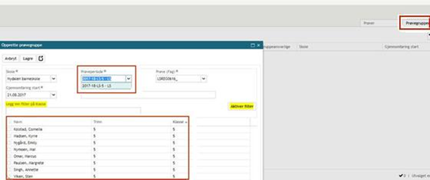 Marker elever som skal i prøvegruppen og klikk Lagre: