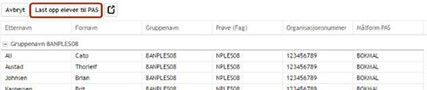 Når arbeidet beskrevet i avsnittene ovenfor er utført kan du laste opp elever til PAS. Dette gjøres fra fanen Prøvegrupper. Den administratoren som laster opp må være registrert i PAS som skoleadministrator for å kunne foreta en slik opplasting (i tillegg må vedkommende være registrert med en primær e-post og primær mobilnr i personkortet). Det er mulig å markere en eller flere grupper for opplasting. Klikk deretter på Last opp elever til PAS. Du bør kontrollere gruppene som forhåndsvises, deretter bekrefter du ved å klikke på Last opp elever til PAS:
