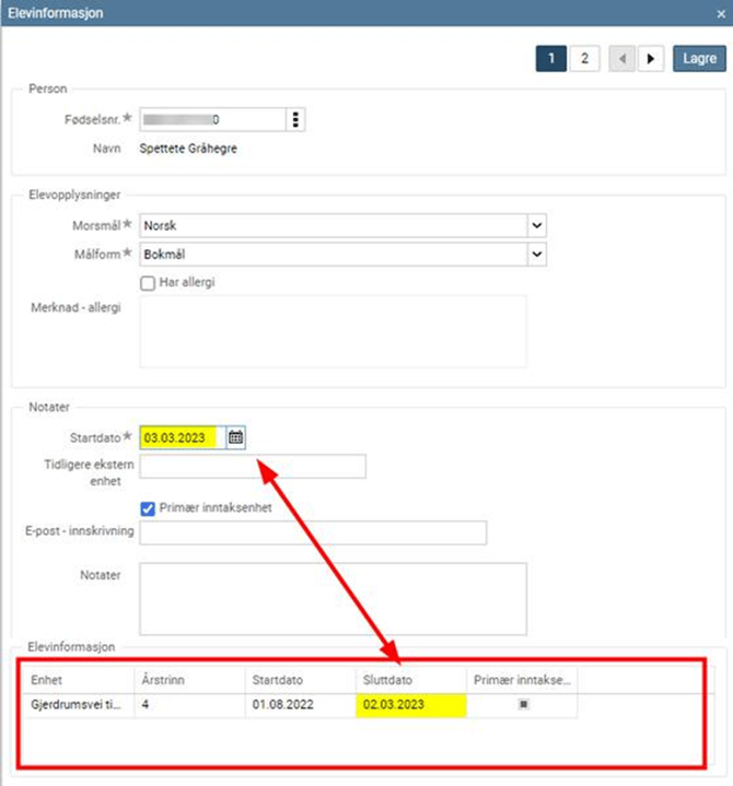 Dersom eleven bytter skole innad i kommunen: sjekk i feltet Elevinformasjon for å se innskrivningen ved avgiverskolen. For å kunne sette Primær inntaksenhet på ny innskrivning kan det ikke være overlapping, så du må angi startdato for innskriving som er minst n dag etter sluttdatoen tidligere skole har angitt.