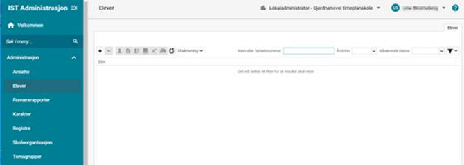 Gå til Administrasjon > Elever og du kommer til oversiktsbildet for elevregisteret. Det vises automatisk som en tom side før du setter et filter. Bruk hurtigfilter, eller benytt Søk/filter-funksjonen for et mer detaljert søk. Les mer i denne guiden: Søk/filter.