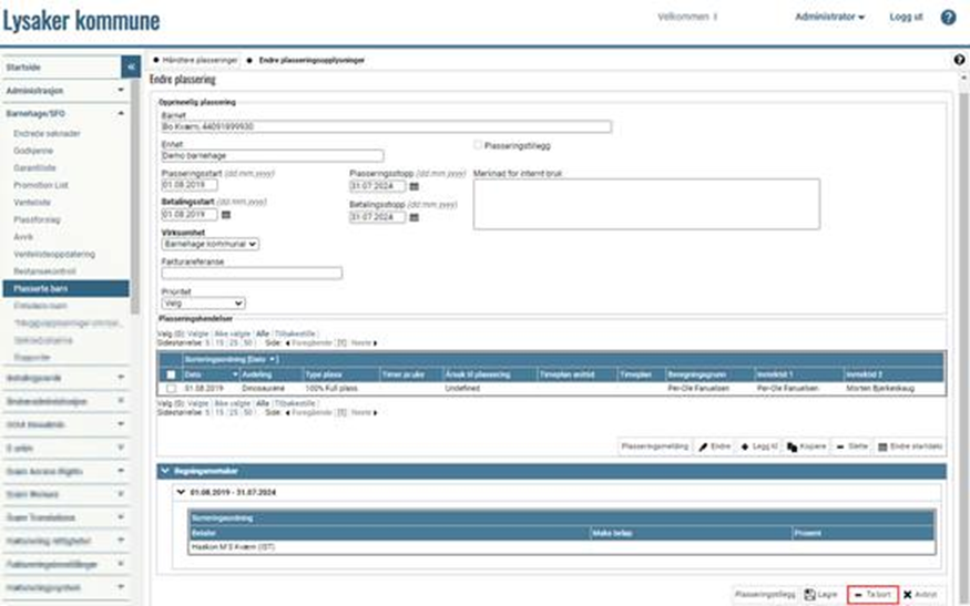 Gå til Barnehage/SFO > Plasserte barn Finn plasseringen og klikk på endreikonet Klikk på knappen Ta bort nederst til høyre: