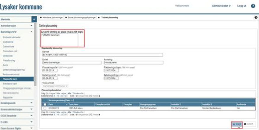 Oppgi årsak i feltet Årsak for sletting av plass, og trykk på Lagre: