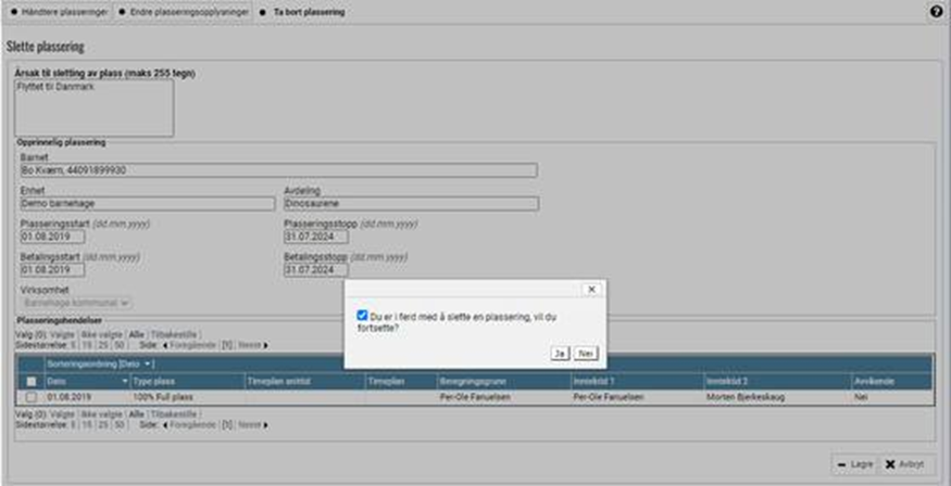 Ved oppsigelse før oppstart, anbefales det at plasseringen slettes. Denne framgangsmåten kan også benyttes ved feilregistrert dobbeltplassering hvor man ønsker å slette den ene plasseringen. Vanligvis har kun sentraladministrator rettighet til dette.