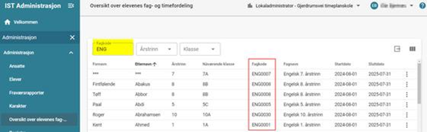 Med denne funksjonaliteten kan lokaladministrator få oversikt over fag/faginstanser elevene har og filtrere på disse.