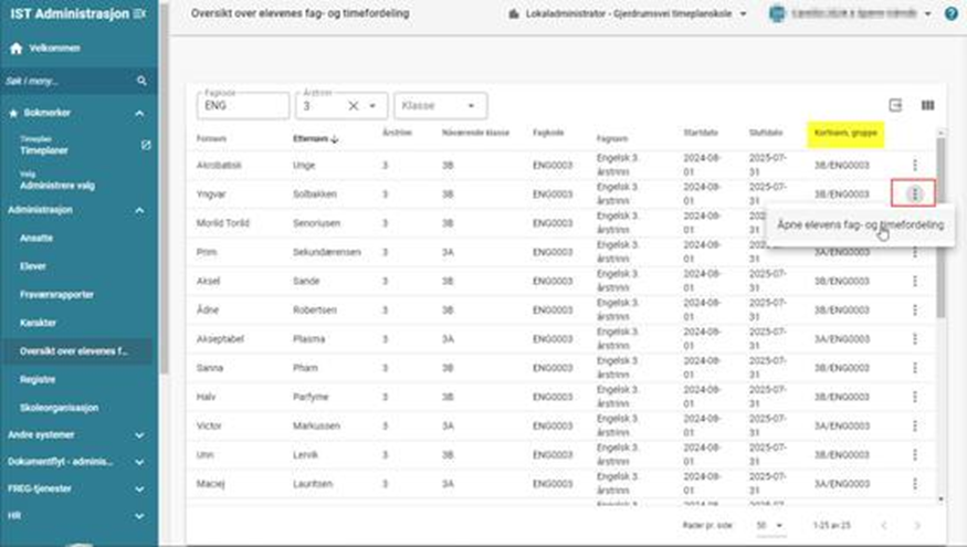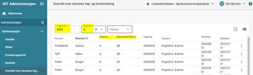 Brukere som har fått tildelt rettigheten ser et menypunkt under Administrasjon som heter Oversikt over elevens fag og timefordeling. Det er mulig å sette ulike filtere for å hente fram ønskede data. Du kan gå direkte til en elevs fag- og timefordeling via knappen med tre prikker.