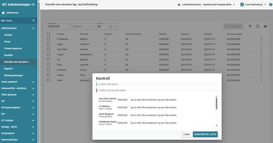 - Hvis det finnes karakter i faget vil det ikke slettes. Du får en melding om at det finnes karakter (se bildet), og det er mulig å eksportere listen til Excel om ønskelig (nyttig hvis du forsøker å slette for mange elever samtidig og noen av dem har karakter som skal fjernes).