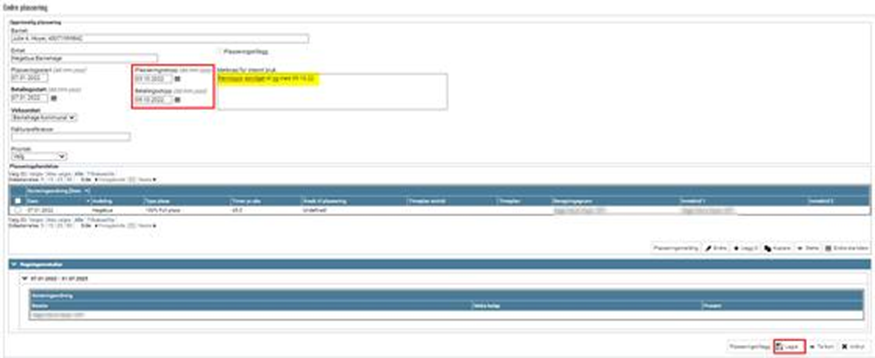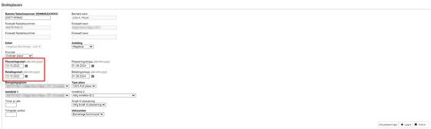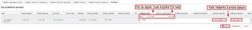 Registrer Plasseringsstopp og Betalingsstopp lik siste dato før permisjonen starter. Skriv inn i feltet Merknad for internt bruk hvor lenge permisjonen er innvilget. Avslutt med Lagre: