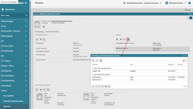 Feltet Adresser viser en eller flere adresser for den valgte personen. De fleste har FREG import, og da vises folkeregisteradressen her. Det er mulig å legge til flere adresser om ønskelig. En adresse har Startdato og Sluttdato. Administrator kan se og redigere adresseoppføringer før startdatoen trer i kraft, noe som gir full kontroll over kommende adresseendringer.