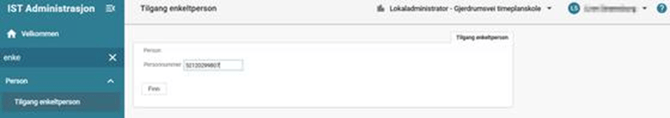 Når tilgangen er koblet til den ansattes konto, vil lokaladministrator se menypunktet Person > Tilgang enkeltperson. Det er da mulig å søke opp personer ved hjelp av kun fødselsnummer, og gjøre eventuelle endringer på personen via personkortet.