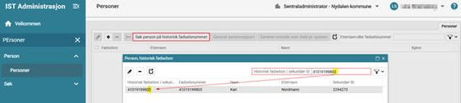 En administrator med rettigheter til å lete opp personer (alle brukere med lesetilgang til personregisteret), har mulighet til å søke opp personer med historiske fødselsnummer, herunder midlertidige. Dette lar deg som administrator f.eks. finne et barn / en elev som du kun har det midlertidige eller utgåtte fødelsesnummeret til. Det er også mulig å søke på fødselsnummer som ikke har blitt erstattet av et annet / som ikke har blitt endret. Gå til Person > Personer > trykk på Søk person på historisk fødselsnummer > skriv inn nummeret i feltet Historisk fødselsnr / sekundær ID.