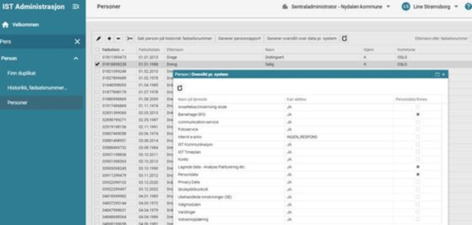 I Person > Personer kan administrator velge en person og trykke på Generer oversikt over data pr. system. Funksjonaliteten gjør at administrator enkelt kan identifisere alle systemer i IST Administrasjon som inneholder data relatert til denne personen. Samme oversiktsvisning er også tilgjengelig i rutinen for Slett person fullstendig. (Per i dag inngår ikke alle tjenester i denne oversikten, men det vil leveres stadig flere tjenester). Administratorer må ha minimum lesetilgang til personregisteret for å kunne benytte denne funksjonaliteten.