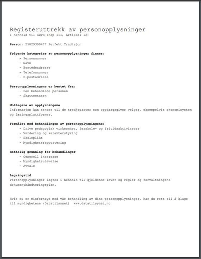 Det er mulig å hente ut en GDPR-/personrapport. Hensikten med rapporten er at Sentraladministrator skal kunne levere ut et dokument til personer som etterspør dokumentasjon på hvorfor opplysninger om vedkommende finnes i systemet. Per nå er ikke dette en fullstendig GDPR-rapport/registeruttrekk. Rapporten er tilgjengelig for brukere med redigeringstilgang til personregisteret. Innholdet er per nå i hovedsak statisk. Det eneste dynamiske innholdet er kategoriene navn, fødselsnummer, samt adresse, telefonnumre og e-postadresser, dersom dette finnes i systemet.