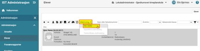 - Elev slettes: Du kan slette en elev fra elevregisteret dersom eleven ved en feiltakelse ble registrert på skolen men aldri har gått der og det ikke er behov for noen historikk på dette. Gå til Administrasjon - Elever - marker eleven - klikk Slett (minusknappen). NB! Det er kun i elevregisteret du i dette tilfellet skal slette. Du skal IKKE slette i personregisteret. Ingen historikk vil bli lagret.