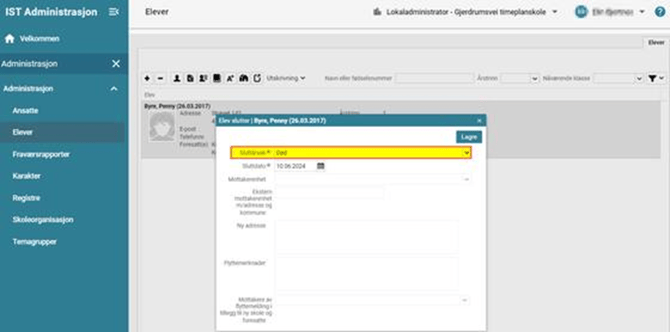 Gå til Administrasjon > Elever > søk opp elev. Marker elev > klikk på Utskriving > Elev slutter: