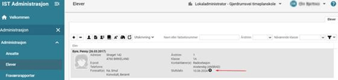 Alle relasjoner til klasse og undervisningsgrupper slettes, og eleven har ingen aktiv innskriving ved skolen lenger. Eleven kan søkes opp historisk ved at du endrer datofilter, det vises da et lite kors ved siden av elevens sluttdato:
