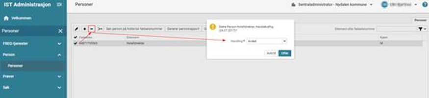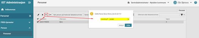 Det å slå sammen person og det å avregistrere en person er funksjoner som krever spesielle rettigheter. Avregistrering kan ikke reverseres og må benyttes med forsiktighet. Det er laget en egen rettighet for dette og den ligger ikke tilgjengelig for rollen Lokaladministrator. Ta kontakt med Sentraladministrator.