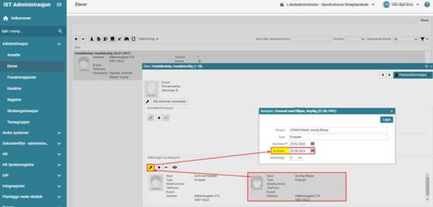 Bildet til høyre viser hvordan du kan endre adresse, telefon eller e-post for en foresatt tilkoblet en elev. Gå til elevens Personinformasjon og klikk på den foresatte > klikk på Persondetaljer ("øyet") > klikk på det du skal endre > endreikonet > skriv inn endringen og Lagre