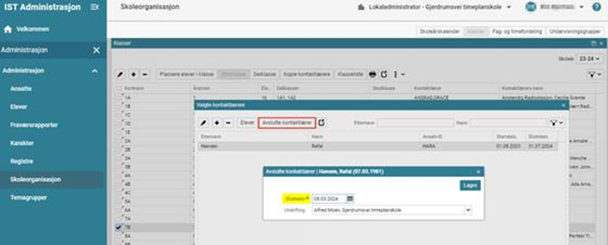 Gå til Administrasjon > Ansatte for å avslutte ansettelsen inneværende skoleår ved å sette sluttdato: