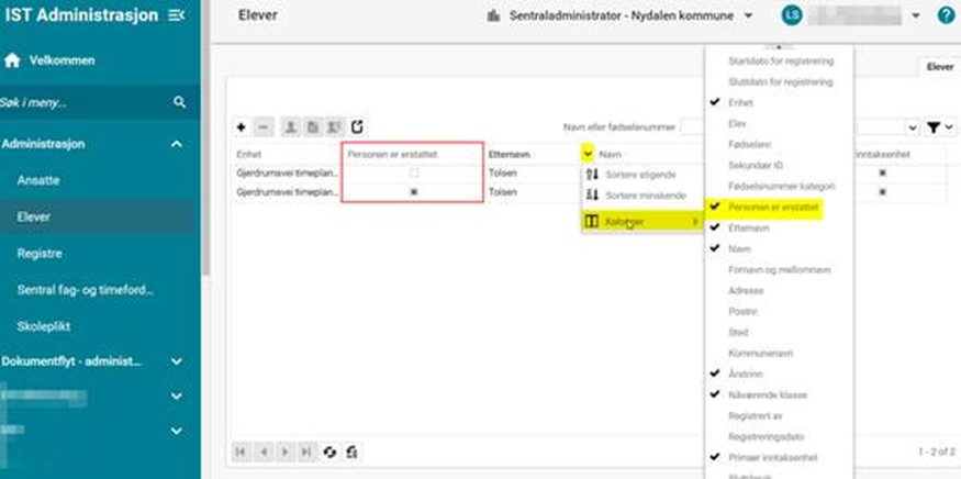 Etter du har slått sammen en elev, anbefaler vi å følge rutinen Slå sammen skoledata, da det kan være underliggende poster som ikke har blitt slått sammen. (Det kan være at dette vises ved at de foresatte ikke lenger er synlige på eleven i klasselista, eller at du ser en markering i kolonnen Person er erstattet i elevregisteret).