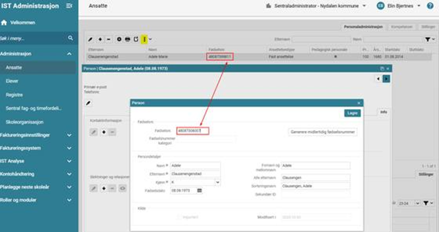 Om du skulle få meldingen Det medfølgende fødselsnummeret finnes allerede, er det fordi personen finnes i databasen men ikke er synlig i brukergrensesnittet. Ta kontakt med IST Support for å få personen aktivert.