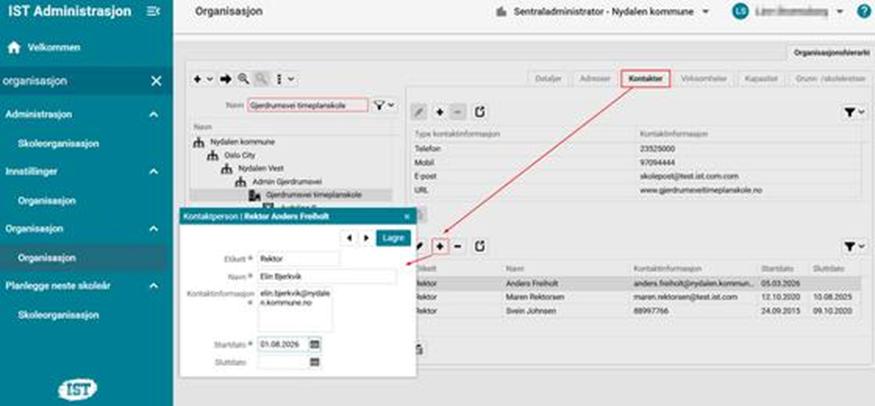 - I trestrukturen til venstre søker du fram skolen. Gå deretter til fane Kontakter.