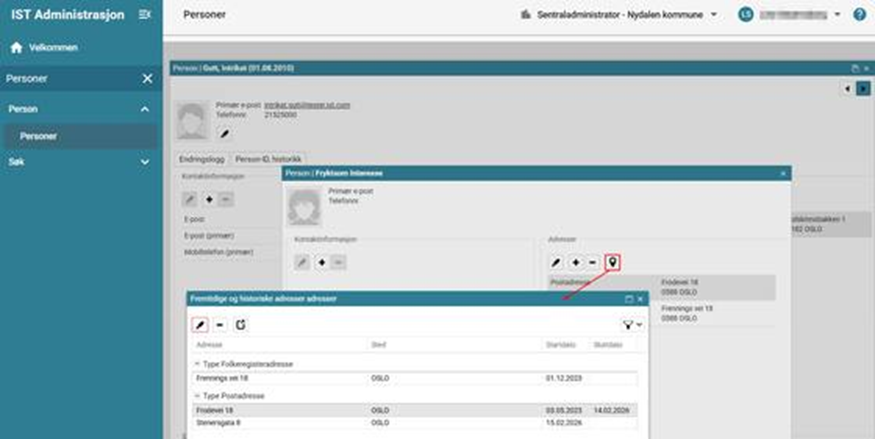 - Trykk på ikonet Fremtidige og historiske adresser for å åpne et vindu som viser mer detaljer og gir mulighet for endring.