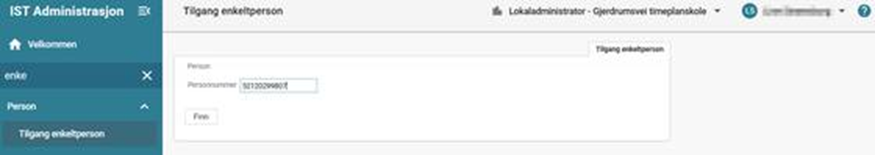 Når tilgangen er koblet til den ansattes konto, vil lokaladministrator se menypunktet Person > Tilgang enkeltperson. Det er da mulig å søke opp personer ved hjelp av kun fødselsnummer, og gjøre eventuelle endringer på personen via personkortet.