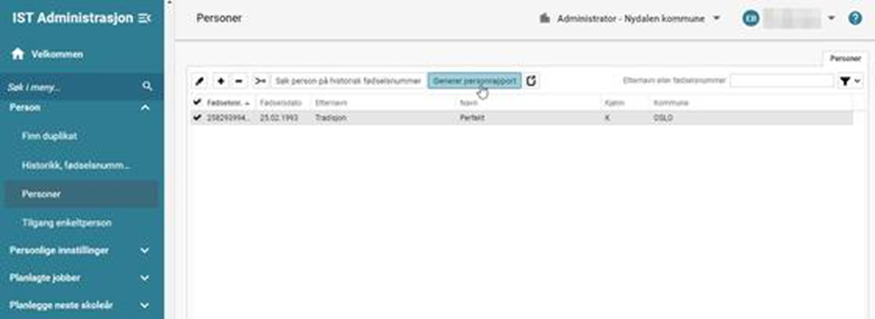 I Person > Personer kan administrator velge en person og trykke på Generer oversikt over data pr. system. Funksjonaliteten gjør at administrator enkelt kan identifisere alle systemer i IST Administrasjon som inneholder data relatert til denne personen. Samme oversiktsvisning er også tilgjengelig i rutinen for Slett person fullstendig. (Per i dag inngår ikke alle tjenester i denne oversikten, men det vil leveres stadig flere tjenester). Administratorer må ha minimum lesetilgang til personregisteret for å kunne benytte denne funksjonaliteten.