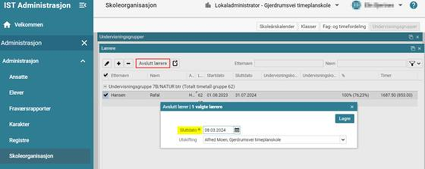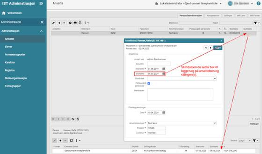 Gå til Administrasjon > Ansatte for å avslutte ansettelsen inneværende skoleår ved å sette sluttdato: