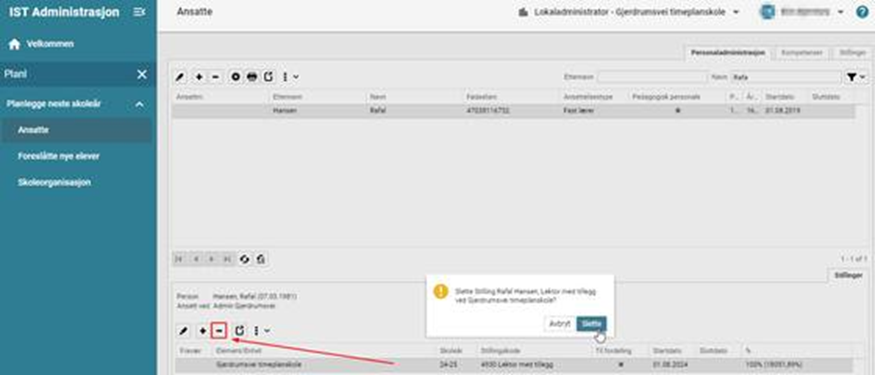 Dersom skolen allerede har kopiert til neste skoleår, må du du gå til Planlegge neste skoleår > Ansatte og slette stillingen(e) som har blitt kopiert til neste skoleår. (Om det også har blitt opprettet kontaktlærerrelasjoner og kobling til undervisningsgrupper må disse slettes først):