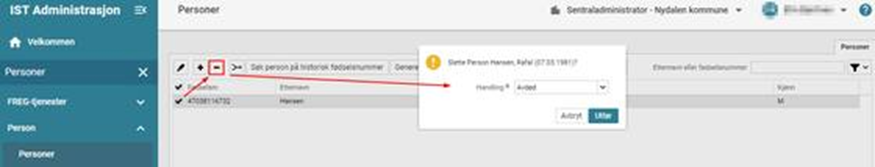 - I menypunktet Person > Person: Slett personen ELLER i FREG-vask > Logg: Slett personen fra loggen ved å markere raden og klikk på knappen Slett valgte personer (ikke klikk på søppelspannikonet).