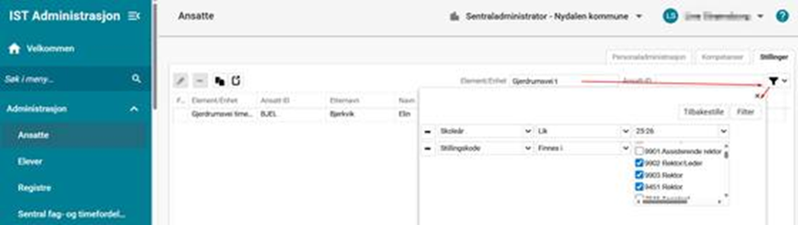 Gå til fanen Stillinger og sett filter for å finne personer med stillingskode for Rektor (merk at det kan finnes flere og du bør i så fall hake av for alle rektorkodene):