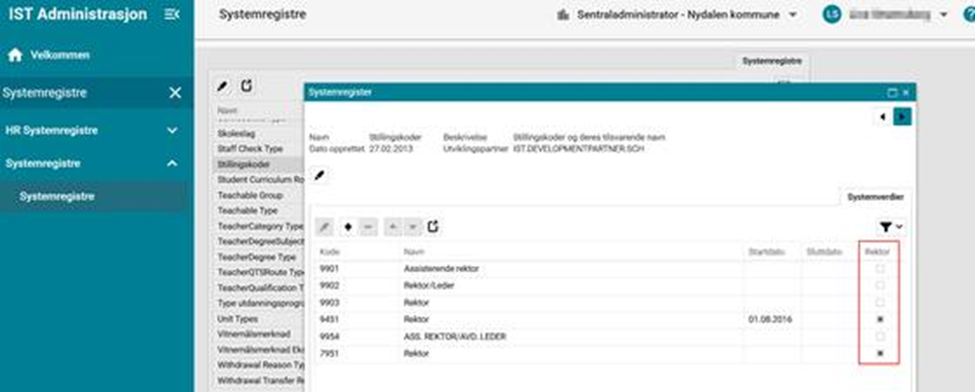 Det må finnes en rektor med ansettelse ved skolen i Administrasjon > Ansatte > Personaladministrasjon. Det kan ikke ligge flere enn en rektor med aktiv stilling ved enheten. Sørg for å kontrollere at det finnes en sluttdato på forhenværende rektorstilling og at ny rektorstilling ikke overlapper (startdato senere enn forriges sluttdato).