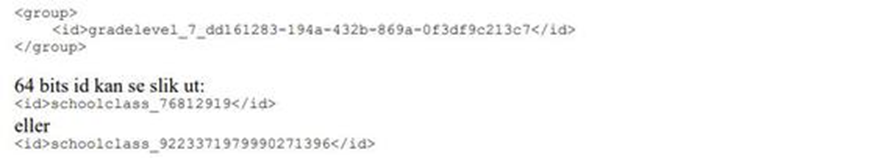 Systemgenererte id'er er satt sammen med et semantisk prefix for lesbarhetens skyld. (f.eks. root_ unit_ schoolclass_). Det finnes også ider som består av to eller tre ledd: semantisk del + _ + id1 + _ + id2