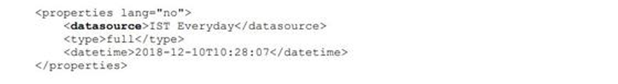 Toppnivå i fila er Enterprise og inneholder Properties og timestamp for når filen er produsert. Type vil alltid være «full» da vi ikke leverer inkrementelle uttrekk.